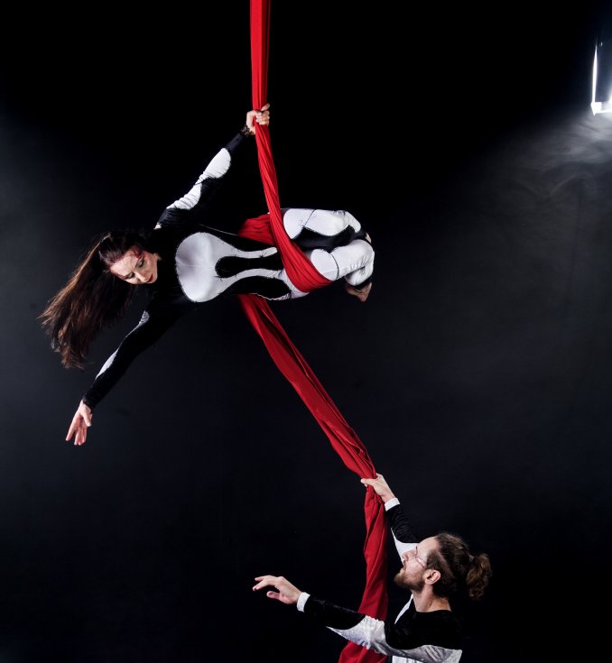 Творческие номера на воздушных снарядах - полотна, кольцо, и в партере - трости, партерное кольцо